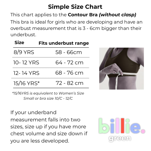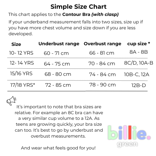 Please scroll down to see our size charts per product. There is some overlap as most girls can fit into two sizes. So please select the smaller size for a snug and more supportive fit OR size up for a comfort fit and room to grow. We offer free exchanges if you're not 100% happy.